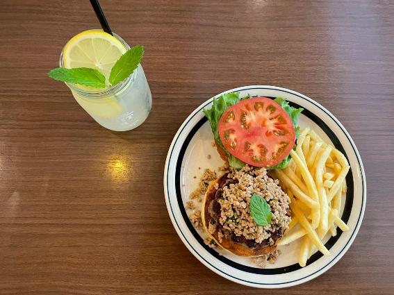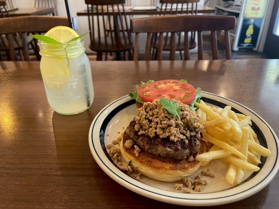 2025年6月はタイの伝統料理であるラープ・ムーをベースとしたエスニカルな「アジアンバーガー」。豚ひき肉(ムー)がハーブやスパイス(ラープ)で調理され、パティの上にのってサンドされます。