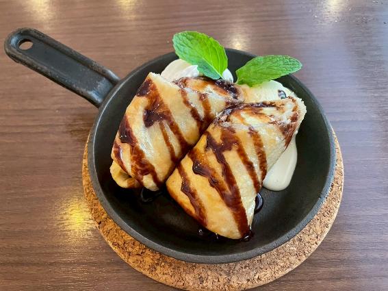 ブリトーを揚げた揚げ春巻のようなイメージで、アイスクリームとホイップクリームが添えられています。パリッとしたところが残る温かい皮の食感ととろけるようなバナナの甘み、それに冷たいアイスが絶妙にマッチします。