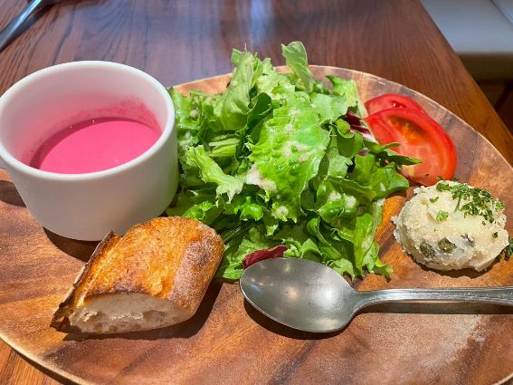 思わず目を見張ってしまうほど存在感のある色味のスープは、今が旬であるビーツのポタージュ。ポテトサラダはたらこの塩味で大人な仕上がりになっており、旬のトマトはまるで甘い果実のよう。