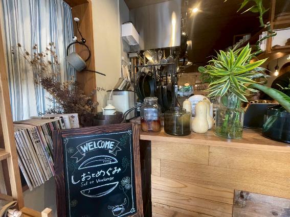 「しおとめぐみ」の店名は、調理の技術的な意味が含められた“しお”と、食材を意味する“めぐみ”の組み合わせ。フランス語名である“Sel et Vendange”では、“Vendange”には葡萄の収穫という意味があり、料理とワインという隠喩にもなっています。