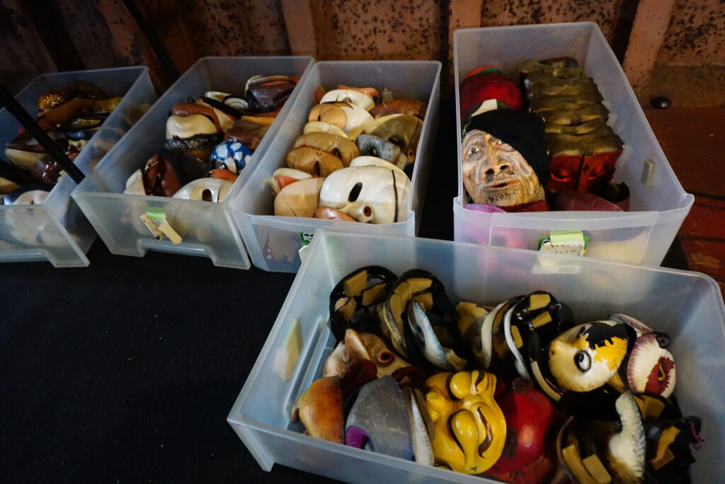 横浜ボートシアターでは、劇団創立以来、主として仮面を用いた演劇を追求しています。「自分でも人間でもないなにかになって、人間を超えた表現ができる」と、まだ木造の艀を舞台としていた頃から演技レッスンのために使用していた仮面。