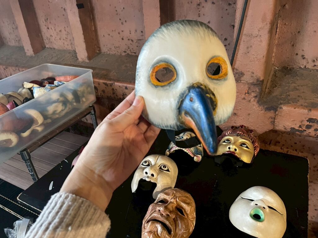 仮面を少しだけ装着させてもらいましたが、自分の顔が人に見られていないことに、不思議な安心感が湧きました。視界が狭くなることで、外の世界よりも内側の感覚が強まり、ふと、これなら別人になりきれるのではないかという感覚が芽生えます。